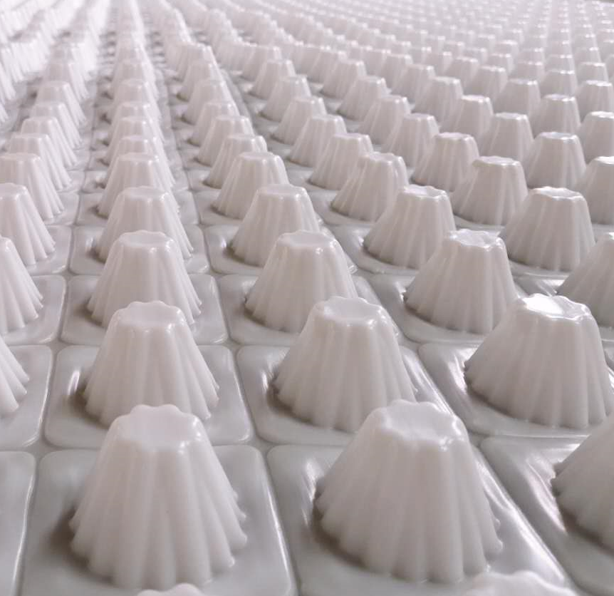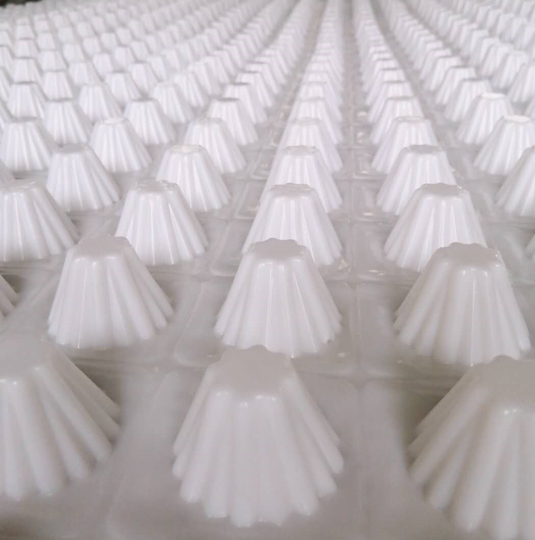 圓錐突臺的頂面膠接一層過濾土工布,以阻止泥土微粒通過,從而避免排水通道阻塞使孔道排水順暢。 傳統(tǒng)的排水方式使用磚石瓦塊作為導(dǎo)濾層、使用較多的鵝卵石或碎石作為濾水層、將水排到指定地點。而用排水板取代鵝卵石濾水層來排水則省時、省力又節(jié)能、節(jié)省投資、還能降低建筑物的荷載。